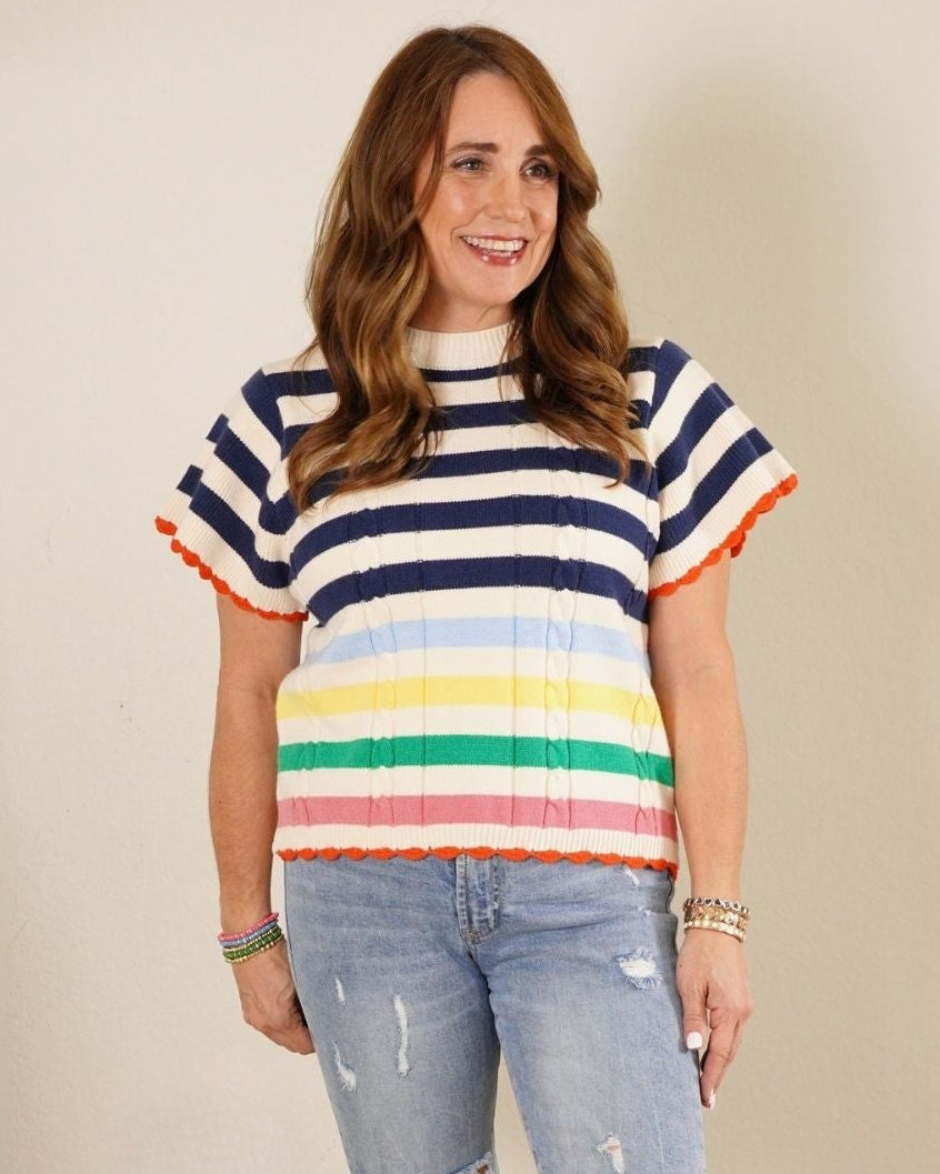 Featuring a navy and white nautical stripe that transitions into a vibrant, sunny rainbow palette, this top is finished with a charming orange crochet scalloped trim on the sleeves and hem. The subtle cable knit detailing adds a touch of high-end texture, making the Carter an easy favorite for those who love a "modern classic" look with a trendy twist.