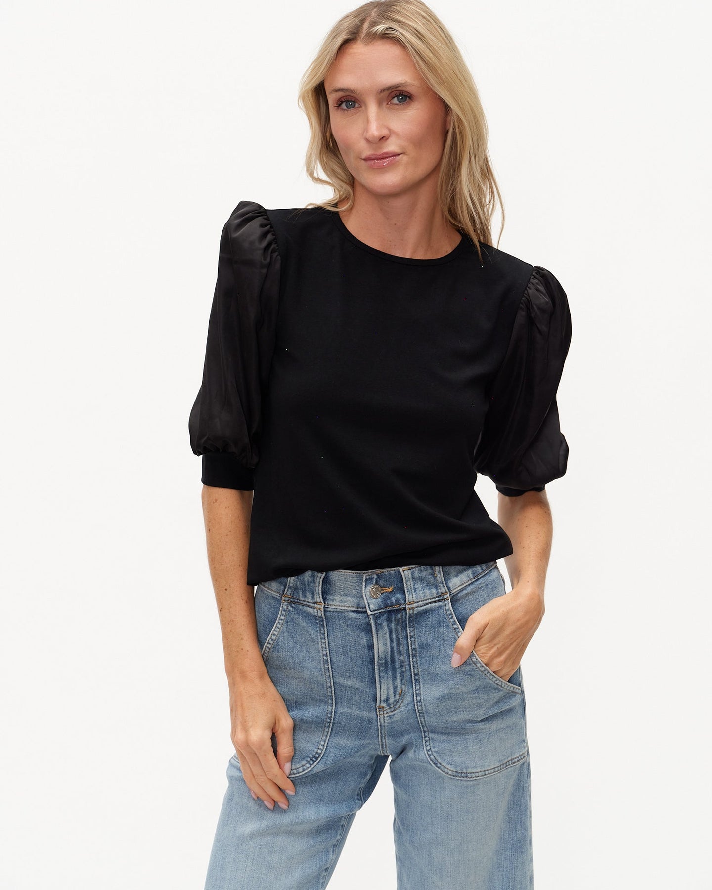 This elevated black top is the perfect blend of structure and softness. Designed with a smooth, satin-finish body and subtle puff sleeves in a sheer fabric, it adds just enough drama while staying effortlessly wearable. The clean crew neckline keeps it polished, while the tailored fit makes it easy to tuck or wear loose.